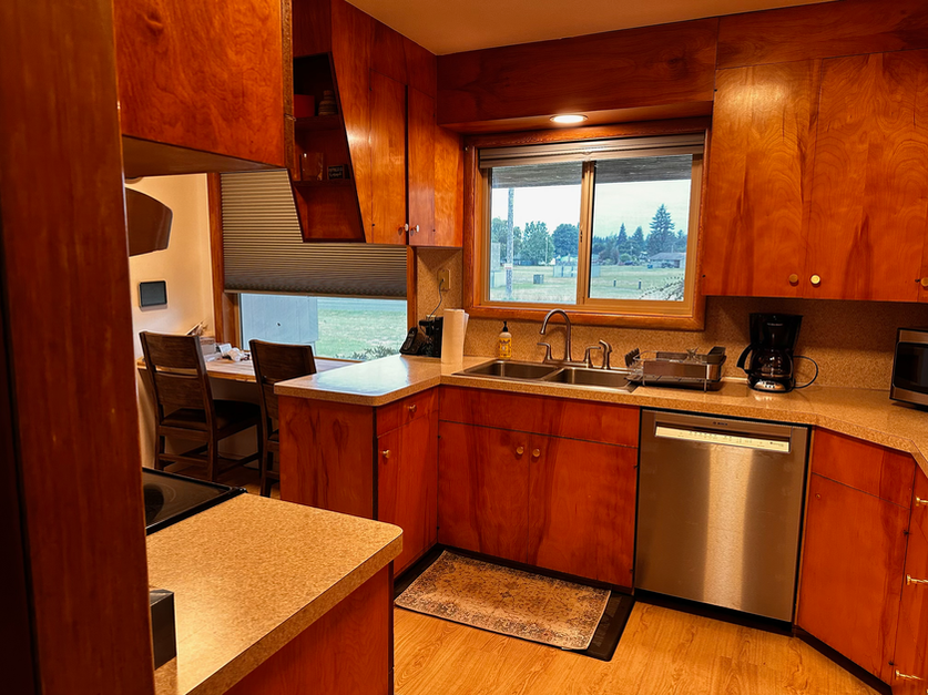 Unwind in the woodsy room, with two queen beds and plenty of room to spare. Fun fact: the paneling in the room was sourced by Pete, the Army Veteran who built the home. He worked in a Forks sawmill for 40 years.